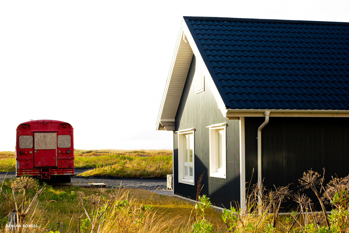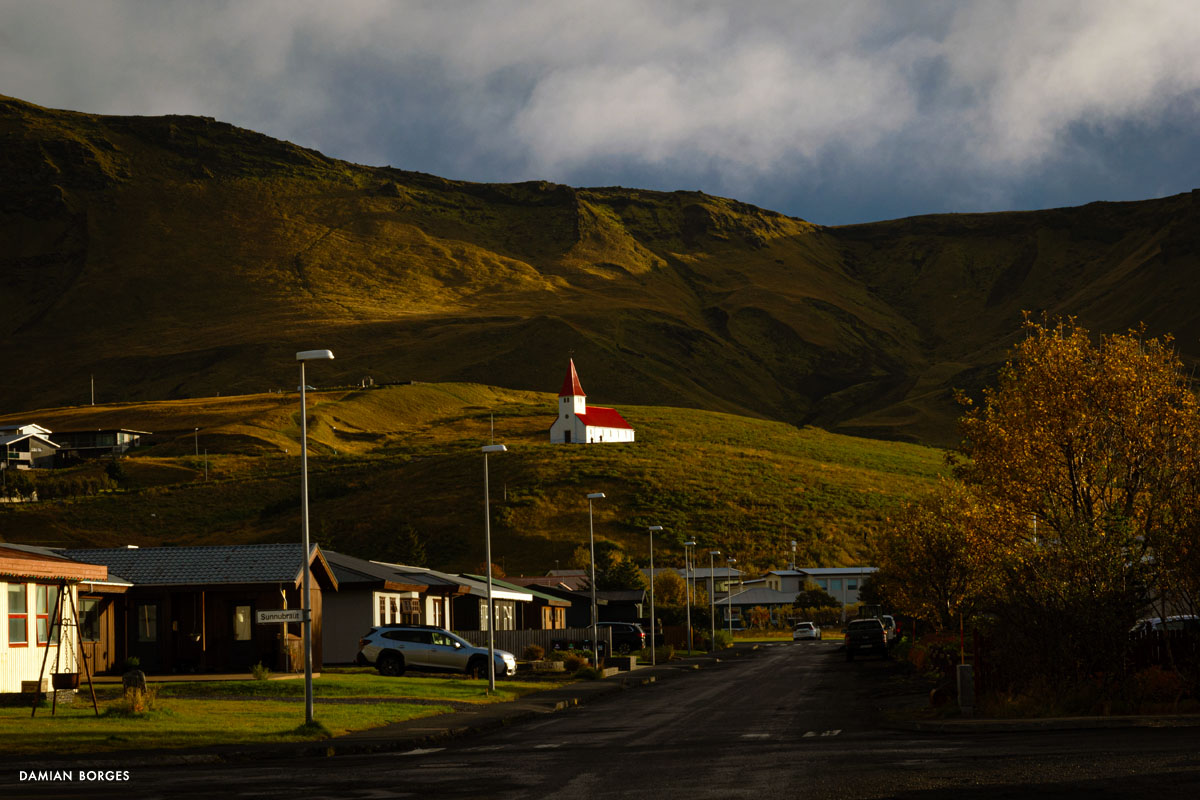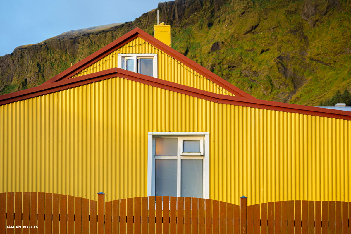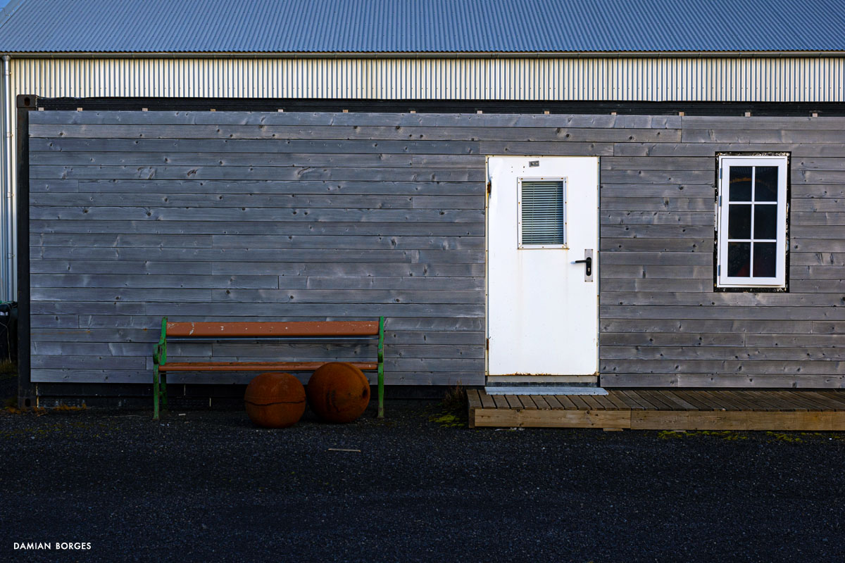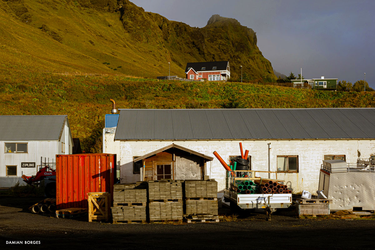 Vík (which means small bay in Icelandic) is an unassuming little town in a spectacular setting in the southern coast of Iceland. It is the only coastal town in Iceland without a port, and the southernmost, rainiest town in the country. Vík is an obligatory refueling and restocking point for travelers, tourists, hikers and drivers from all over the world. Many come to visit Vikurfjara, a notoriously dangerous black sand beach, a few minutes from town. It’s also a summer destination for birdwatchers. I’m here on a gorgeous, welcoming early morning in September –sunshine filtering through the gray clouds. It’s early, the gas stations, liquor stores, restaurants and hotels that crowd the highway look empty. Three hundred people live in Vik, yet visitors briefly swell the population into the thousands –a permanent impermanence. Everyone is still asleep and I can walk the solitary streets on my own, discovering and photographing without interruption –I only saw one person walking and two cars circulating. I saw houses and buildings, old, new, under construction; containers, lots of strewn and stacked containers; decaying objects and mechanical remains; and some local fauna and flora. The weather this morning is pleasant and the temperature comfortable, yet I can’t help but think that I would not last long under the harsh conditions of winter in this beautiful, savagely natural environment. As dawn slipped away and humanity resurfaced, I packed my car, had breakfast, and took my leave of Vík, continuing my drive along the Icelandic coastline.–Damian Borges